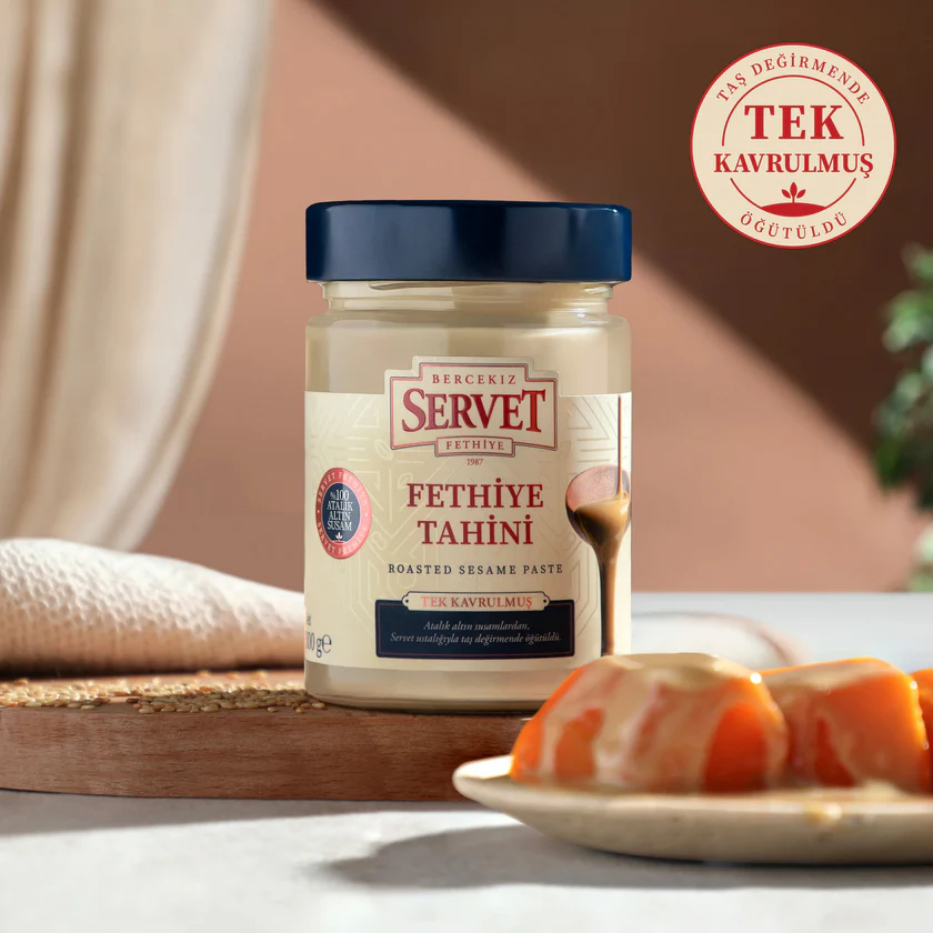 Servet Tahini, ipeksi kıvamıyla, taş değirmende çekilmiş yerli susamın taze taze mis gibi kokusuyla farkını daha tadına bakmadan bile anlayacağınız bir tahin.